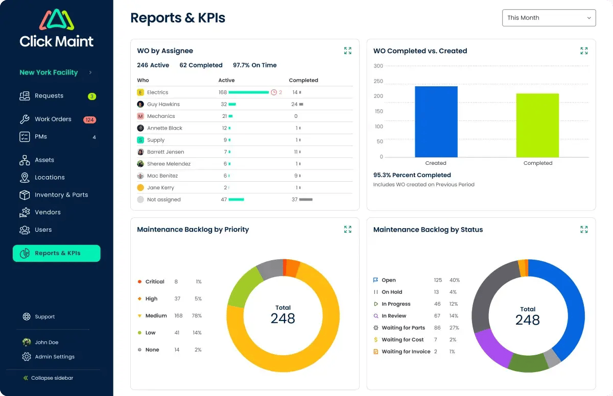 Click Maint's reporting capabilities are well-suited for SMBs allowing admin users to get insights on maintenance costs, work order completion times, asset downtime and costs, and backlog. It’s lacking in detailed reports on asset depreciation and life cycle analysis.